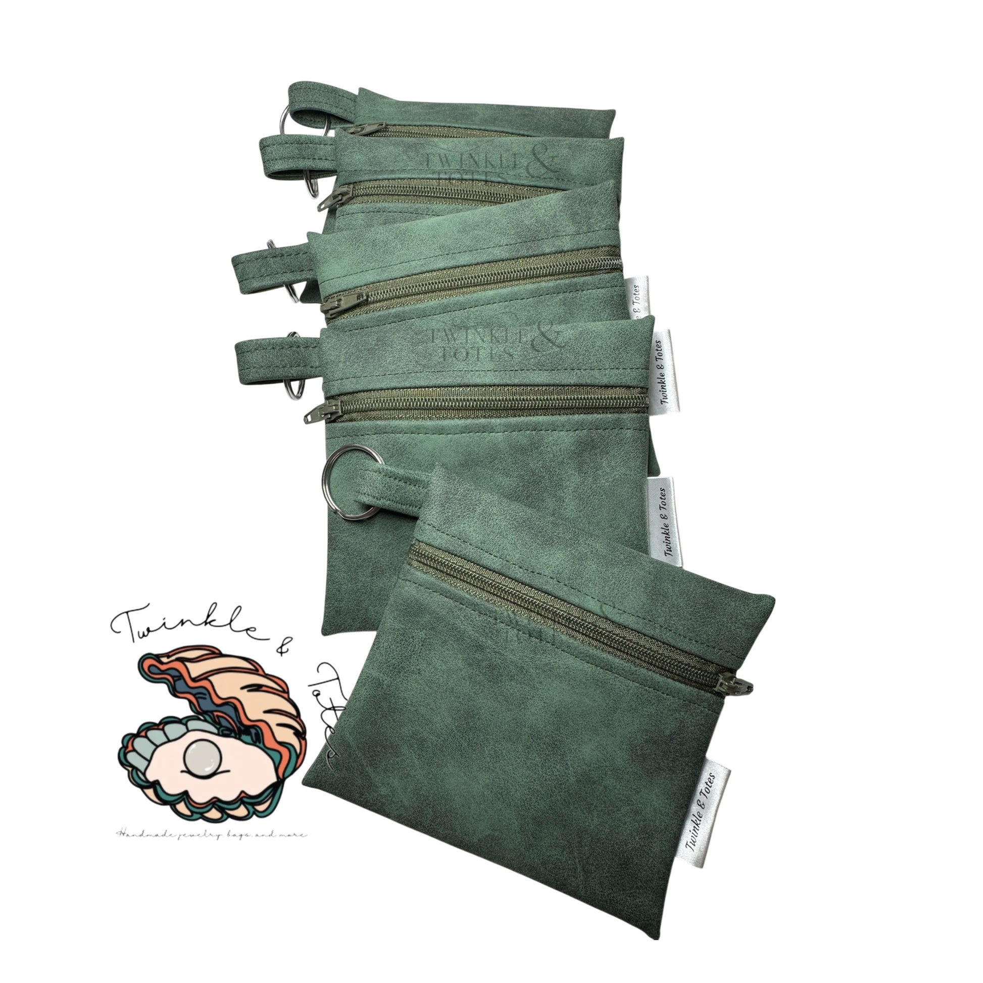 These specific coin purses are made from a rustic, deep olive-green faux leather exterior, with a green and black plaid flannel lining.
